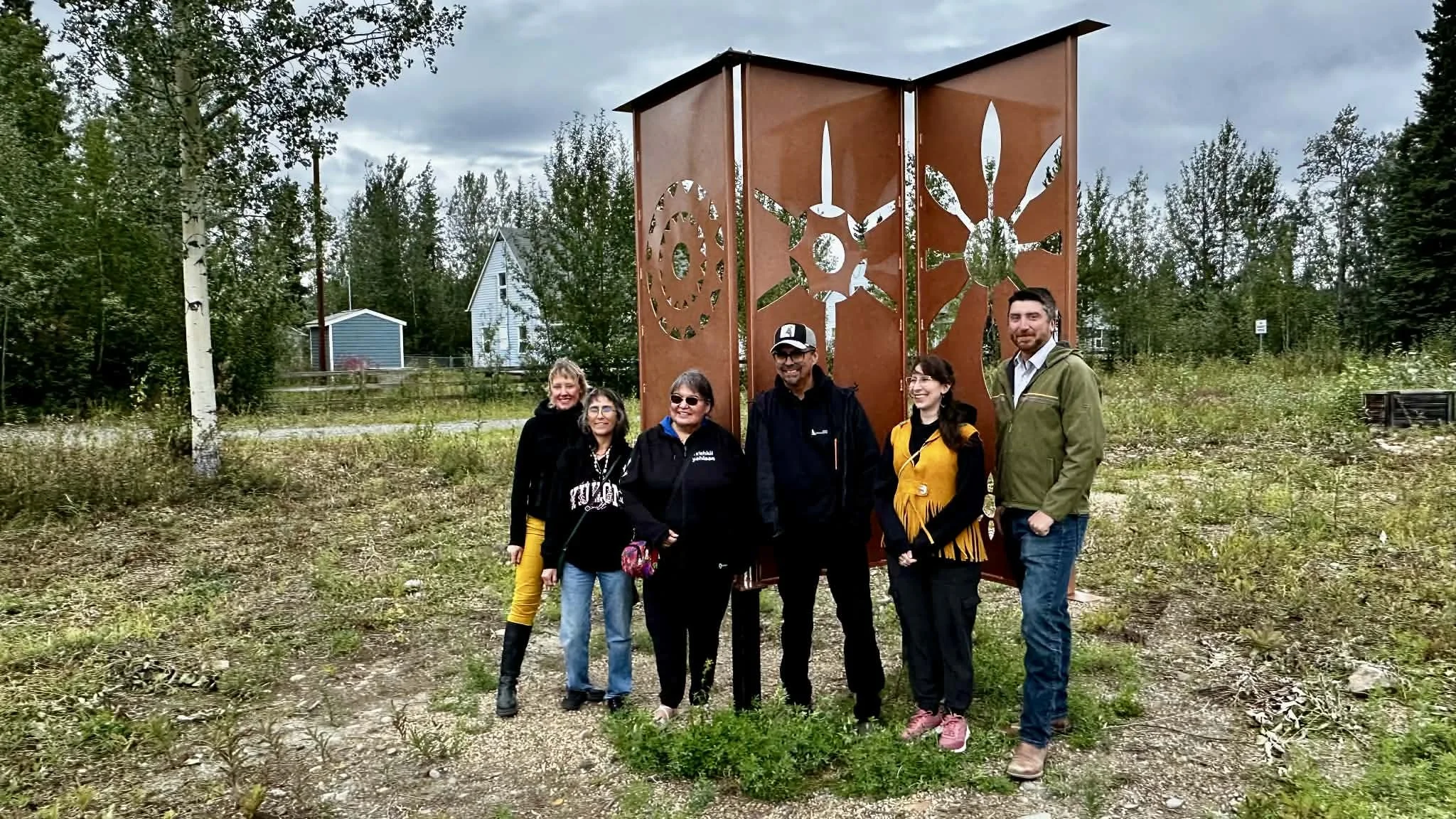 Copper Niisüü Executive Team with Consultant Jennifer Macgillvray and Artist and Former Vice-President Teresa Vander Meer-Chasse in front of Saa Taak / Se Tak